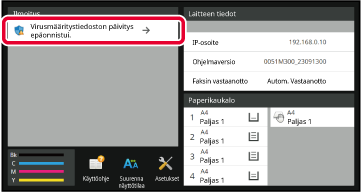 Kun virus on havaittu syöttötiedoissa, kosketuspaneelissa näkyy, että on havaittu virus, syötettävän työn syöttötiedot peruutetaan ja tiedot tai työ, joka oli valmiina tulostettavaksi, hylätään. Tietoja tietojen syöttölähteessä (USB-muisti, ulkoinen palvelin jne.) ei poisteta. Kun virus on havaittu tulostustiedoissa, kosketuspaneelissa näkyy, että on havaittu virus, tulostustiedot tai tulostettava työ peruutetaan ja tulostustiedot tai työtiedot poistetaan. Viruksen tunnistusviesti näytetään järjestelmätietojen näytöllä kohdassa ”Ilmoitus”. |