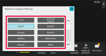 Ces réglages peuvent nécessiter que vous saisissiez votre mot de passe utilisateur. Si vous n'avez pas réalisé l'authentification utilisateur, vous devez saisir le mot de passe administrateur.Sélectionnez la langue que vous souhaitez modifier dans la liste.