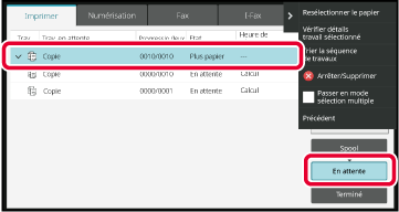 Appuyez sur le travail que vous désirez arrêter ou supprimer, puis sur la touche [Arrêter/Supprimer] du panneau de sélection.