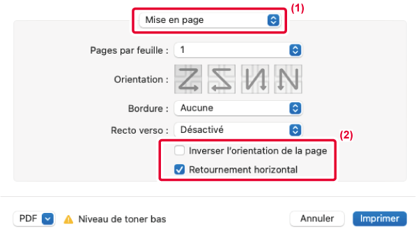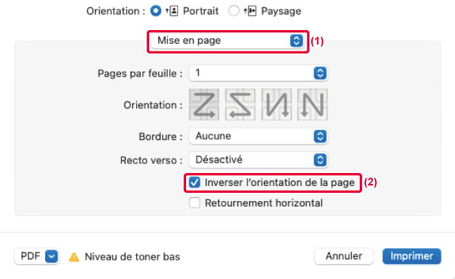rotation de 180 degrés pour obtenir une impression correcte sur
