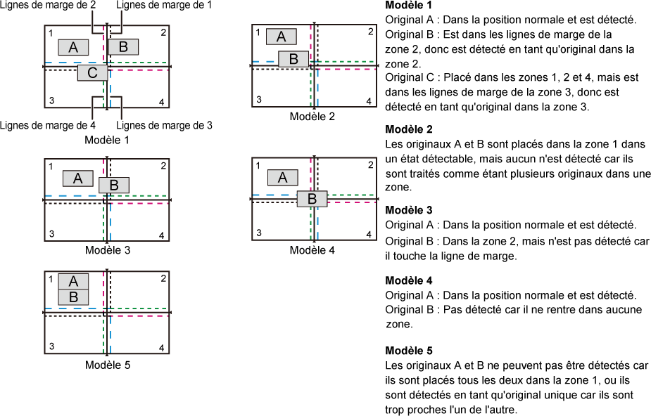 Si vous numérisez les originaux avec le chargeur automatique de documents fermé, les contours des originaux ne pourront pas être détectés et la numérisation échouera. Utilisez toujours cette fonction avec le chargeur automatique de documents ouvert. Si une source de lumière comme une lumière électrique rayonne sur les originaux pendant la numérisation, le recadrage peut ne pas réussir. Réglez l'angle du chargeur automatique de documents de sorte que la source de lumière n'affecte pas l'image.Attention