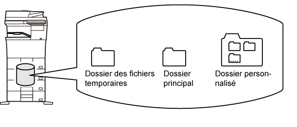 Pendant qu'une copie, un envoi d'image ou un autre travail est exécuté, cette fonction enregistre les données du document sur le disque local. A la différence de Fichier temporaire, divers types d'informations peuvent être joints au fichier quand il est enregistré pour permettre une gestion de fichier efficace. Vous pouvez également définir un mot de passe. |