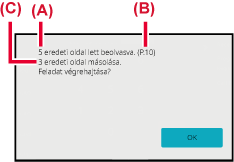 A megerősítő képernyőn a beolvasott eredeti lapok száma az (A), a beolvasott oldalszám a (B), az üres oldalak nélküli példányszám pedig a (C) pozícióban látható.