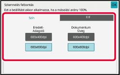 A felbontás a dokumentumadagolóhoz és a dokumentumüveghez külön-külön is megadható. Ha a beállításokkal végzett, koppintson egymás után a [OK] és a [Vissza] gombra.