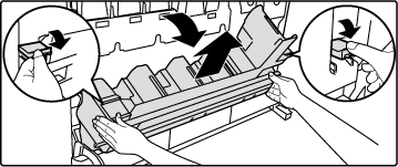 Duw op de ontgrendelknoppen aan weerszijden van de tonerinzamelcontainer, duw de tonerinzamelcontainer omlaag totdat de tonerinzamelcontainer stopt.