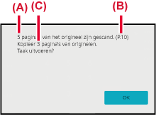 In het bevestigingsscherm worden het aantal gescande originelen in (A), het aantal gescande zijden in (B) en het aantal kopieën, uitgezonderd de lege pagina's, in (C) weergegeven.