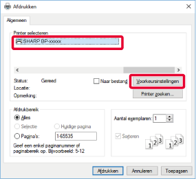 Selecteer de printerdriver voor het apparaat en klik op de knop [Voorkeursinstellingen].