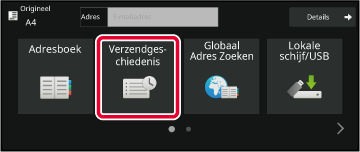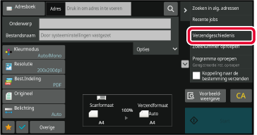 Tik in het basisscherm of het adresboekscherm op [Verzendgeschiedenis] in het actiepaneel.