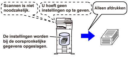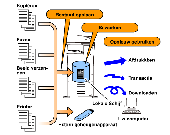 Als er een kopieeropdracht, verzendopdracht of andere opdracht wordt uitgevoerd, worden de documentgegevens met deze functie op de lokale schijf opgeslagen. Gebruik deze functie wanneer u snel en gemakkelijk documentgegevens wilt opslaan zonder een bestandsnaam of andere informatie op te geven. Het opgeslagen bestand kan ook door anderen worden gebruikt. Gebruik deze methode niet om bestanden op te slaan die niet door anderen mogen worden gebruikt. |
