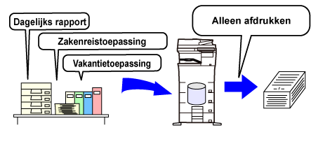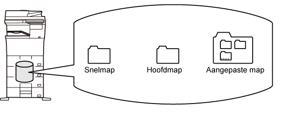 Als er een kopieeropdracht, verzendopdracht of andere opdracht wordt uitgevoerd, worden de documentgegevens met deze functie op de lokale schijf opgeslagen. Anders dan met Snelbestand kunt u verschillende typen informatie aan het bestand toevoegen wanneer het bestand wordt opgeslagen om efficiënt bestandsbeheer mogelijk te maken. U kunt ook een wachtwoord instellen. |