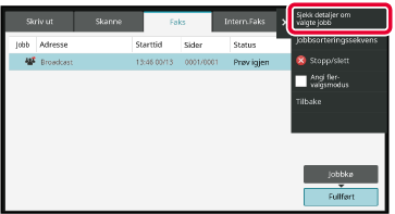 Når du har trykket på tasten for den fullførte gruppeoverføringen, trykker du på [Sjekk detaljer om valgte jobb]-tasten på handlingspanelet.