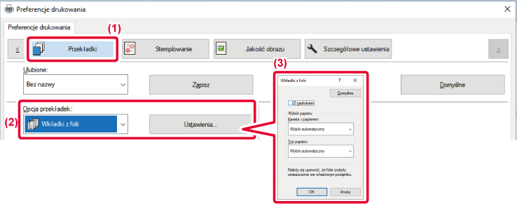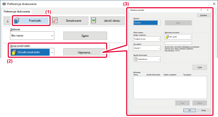 - Wybierz opcję [Okładki/przekładki] w obszarze [Opcja przekładek] i kliknij