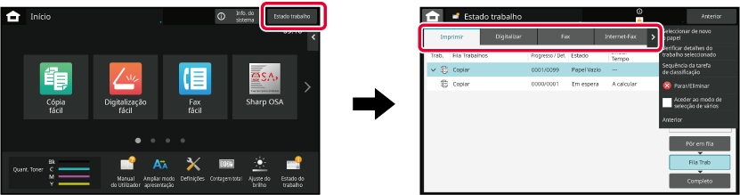 ecrã de estado do trabalho, o ecrã de estado do trabalho aparece.