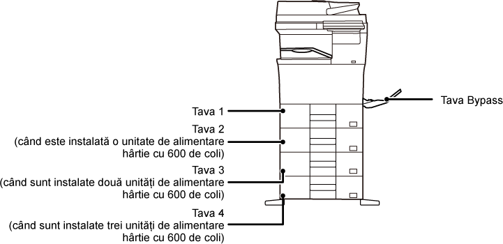 * Dacă hârtia pe care o utilizați în mod normal este Reciclată, Pre-Perforată, Pretipărită, Antet, Color Tip utilizator 1 la 7, setați o greutate corespunzătoare a hârtiei în "Setări" – [Setări de sistem] → [Setări generale] → [Setari pentru Hartie] → [Setări tavă hârtie] → [Greut. Hart.].