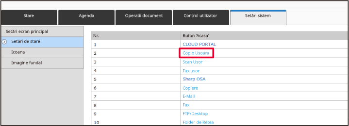 Atingeți [Setări sistem] → [Setări ecran principal] și apoi atingeți tasta [Poziția butonului de pornire].
