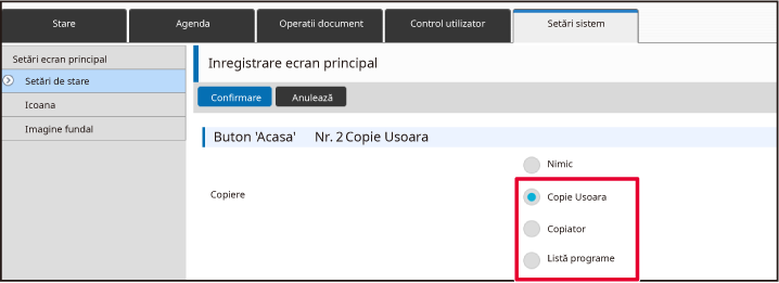 Când executaţi clic pe butonul [Confirmare], ecranul [Inregistrare ecran principal] se închide.Când aţi finalizat configurarea setărilor, executaţi clic pe butonul [Confirmare].