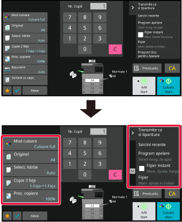 Setările sunt salvate în echipament şi aplicate.Într-un mod normal, cum ar fi Copiere sau