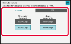 Rezoluţia poate fi setată atât de la alimentatorul de documente, cât şi de la geamul pentru documente. După efectuarea setărilor, atingeți scurt tastele [OK] și [Inapoi] în ordine.