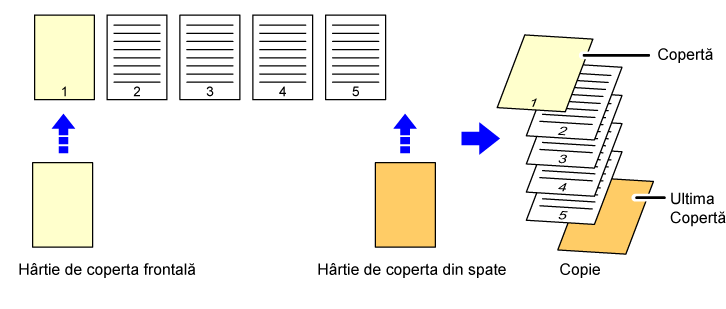![]() Realizează copierea pe o singură faţă a primei pagini a originalului pentru coperta din faţă şi inserează o copertă din spate la sfârşitul copiilor. |