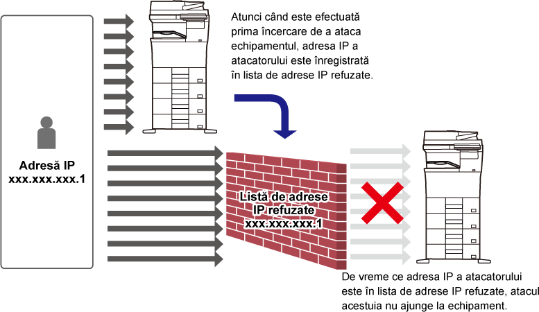 Specificați Documente memorate sau Elibr. lucrare ca funcție de restricționare a lucrărilor imprimantei. Atunci când este specificată funcția Documente memorate și este selectată [Memorare forțată] ca operațiune de restricționare, lucrarea va fi salvată în Documente memorate, chiar dacă această opțiune nu este specificată în driverul imprimantei. De asemenea, dacă este specificată opțiunea Elibr. lucrare, documentul va fi salvat în Elibr. lucrare, chiar dacă această opțiune nu este specificată în driverul imprimantei. |