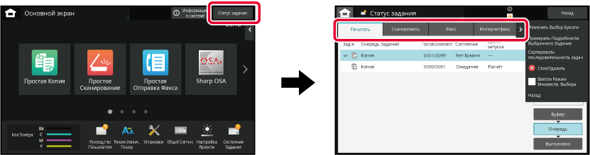 Коснитесь дисплея состояния задания, затем коснитесь вкладки с заданием, параметры которого нужно проверить.
