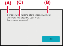 На экране подтверждения указано число сканированных листов оригинала (A), число сканированных сторон (B) и число копий, за исключением пустых страниц (C).