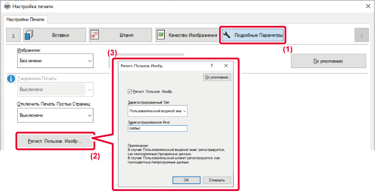 штампа. Если установлено значение [Пользовательский водяной знак], будет зарегистрировано
