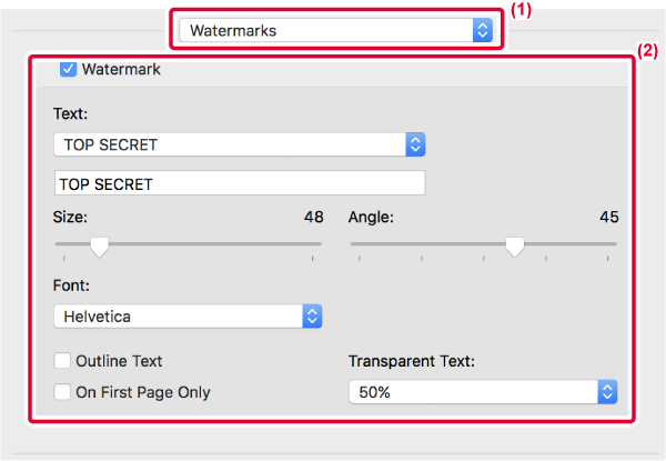 параметры водяных знаков, такие как выбор текста.