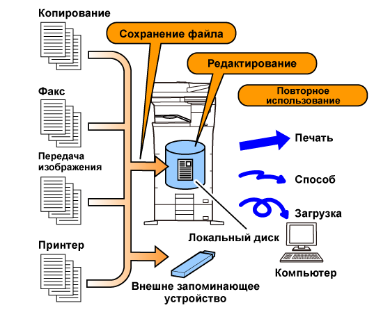 Эта функция позволяет сохранить на локальном диске данные, полученные при копировании, передаче изображений и выполнении других заданий. Используйте эту функцию, если необходимо быстро сохранить данные без ввода имени файла и другой информации. Сохраненный файл может быть использован другими пользователями. Не применяйте этот способ для сохранения файлов, которые не должны использоваться другими. |