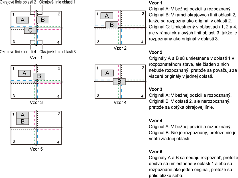 Ak naskenujete originály s automatickým podávačom dokumentov zatvoreným, nebude možné zistiť obrysy originálov a skenovanie sa nepodarí. T/to funkciu vždy používajte s automatickým podávačom dokumentov otvoreným. Ak počas skenovania svieti na originály svetelný zdroj, napríklad elektrické svetlo, orezanie nemusí byť úspešné. Nastavte uhol automatického podávača dokumentov tak, aby svetlo zo svetelného zdroja neovplyvňovalo obraz.Upozornenie