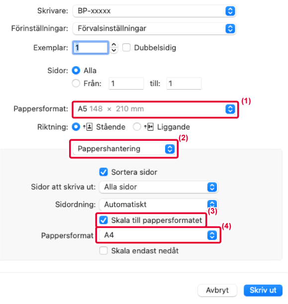 3. Välj faktiskt pappersformat som ska användas för utskrift från [Utmatningsstorlek] (till exempel: A4).