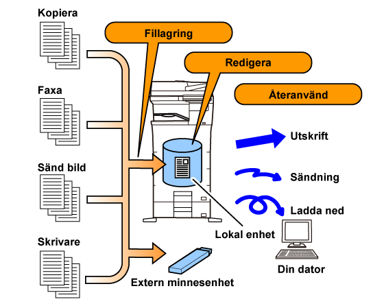 När kopiering, bildsändning eller andra jobb utförs sparar den här funktionen dokumentdata till den lokala enheten. Använd den här funktionen när du vill lagra dokumentdata på ett snabbt och enkelt sätt utan att ange filnamn eller annan information. Den lagrade filen kan även användas av andra personer. Använd inte den här metoden för att spara filer som du inte vill att andra ska se. |