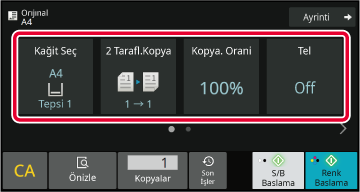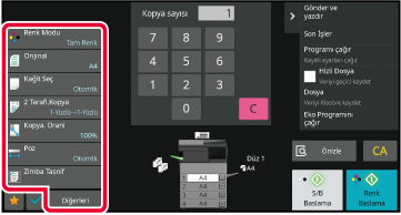 Önizleme ekranında, renk modu ve 2 taraflı fotokopi gibi