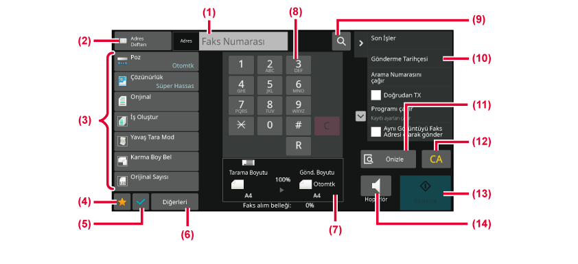 • "Ayarlar" bölümünde, [Sistem Ayarları] → [Ortak Ayarlar] → [Çaliştirma Ayarlari] → [Kolay Mod Ayarları] → [Kolay Faks] seçimlerini yapın.