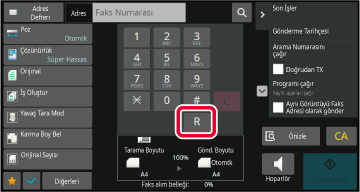 Makine bir PBX'e bağlıysa, normal şekilde her arama yaptığınızda dış hatta otomatik olarak bağlanmak için "PBX ayarı" etkinleştirilebilir. PBX ayarı etkinleştirildiğinde, ana ekranda [R] tuşu görünür. PBX'inizin içinde bir numara çevirmek için, numarayı çevirmeden önce [R] tuşuna dokunarak "PBX ayarı"nı geçici olarak iptal edin.