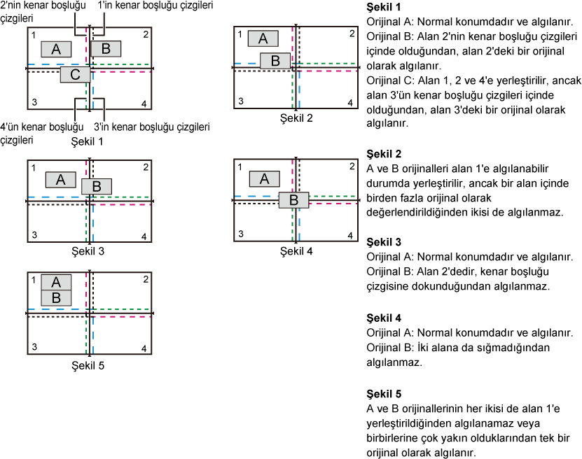 Orijinalleri otomatik belge besleyici kapalı şekilde tararsanız, orijinallerin ana hatlarını algılamak mümkün olmaz ve tarama başarısız olur. Bu işlevi daima otomatik belge besleyici açıkken kullanın. Tarama sırasında orijinallerin üzerinde elektrik lambası gibi bir ışık kaynağı parlarsa, kırpma başarılı olmayabilir. Işık kaynağı görüntüyü etkilemeyecek şekilde otomatik belge besleyici açısını ayarlayın.Dikkat
