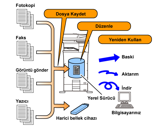 Fotokopi, görüntü gönderme ve diğer işler yapılırken bu işlev belge verisini yerel sürücüye kaydeder. Hızlı Dosya'dan farklı olarak etkin dosya yönetimi sağlamak için dosya kaydedilirken çeşitli bilgi türleri dosyaya eklenebilir. Bir parola da belirlenebilir. |