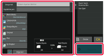 Orijinali otomatik belge besleyicinin belge besleyici tablasına veya belge camına yerleştirin.Dosya adını ve kayıt konumunu kontrol edin ve seçmek istediğiniz ayarların tuşlarına dokunun.
