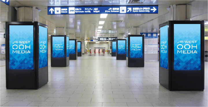 While many displays are installed on the JR Kyoto Station concourse and near the ticket gates, “Kyoto Premium Vision” has realized a new spatial production effect that differs from conventional pillar wrapping signage. The large-scale installation of digital signage was implemented at the key JR-West area stations between 2011 and 2013. We plan to sequentially renew those systems with equipment that meets the needs of the times.