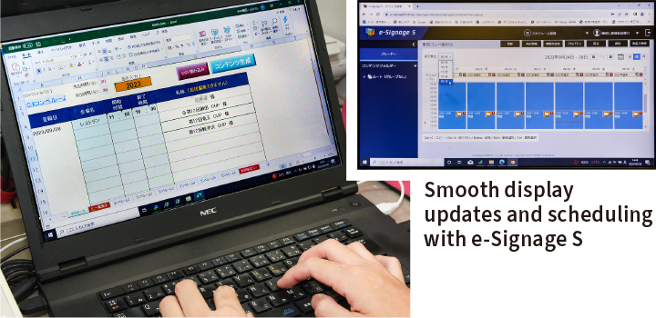 We were looking at going with a single manufacturer for both the displays and the display/distribution system. We did some investigating and found that Sharp's products—as well as Sharp's maintenance support—were superior in terms of cost performance. Also, after conducting an on-site study, we appreciated the fact that Sharp could carefully respond to our on-the-spot requests and proposed the optimal equipment, housing, and system. Moreover, we found e-Signage S (the content display and distribution software) and e-Sheet Signage (which allows content to be created and edited using Spread Sheet) to be easy to operate, which was also attractive.