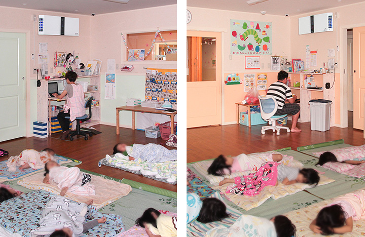 A total of 15 Plasmacluster air purifiers were installed in all nursery rooms, playroom, entrance hall, office, kitchen, and meeting room. The units are operated 24/7 (through a year) maintaining a comfortable air environment throughout the nursery school. We especially noticed a significant improvement in the air cleanliness during the winter when it is difficult to manage the children’s health. The units effectively remove dust that tends to fly up from the children’s napping futon (Japanese style comforter/mattress) and also suppress the stale indoor smell.