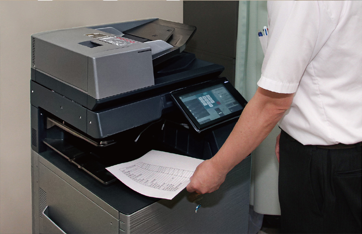 There is a large range of information that is printed on paper for storage and use, such as various financial records, logs, meeting minutes, and so forth. We had implemented home printers in each department, and were using those. Since we had a large number of printers and these units were difficult to manage due to differing manufacturers, ink replacement costs and unit replacement costs due to breakdowns had risen. Further, home printers are not ideal for printing and copying in large quantities. For that reason, in consideration of improved efficiency of printing tasks in the hospital ward, we wanted to change to digital multifunction printers.