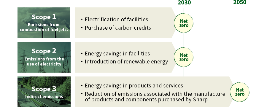 As climate change risks become more apparent and severe worldwide, society is demanding that companies take further action toward transitioning to a net-zero society. In response, Sharp is aiming to achieve net zero CO2 emissions from its own business activities (Scopes 1 and 2) by 2030, and net zero indirect CO2 emissions outside the scope of its activities (Scope 3) by 2050. For Scope 1, Sharp will electrify its facilities and purchase carbon credits. For Scope 2, it will save energy in facilities and introduce renewable energy. For Scope 3, Sharp will make its products and services more energy efficient as well as strengthen cooperation with suppliers to reduce CO2 emissions associated with the manufacture of products and components purchased by Sharp.