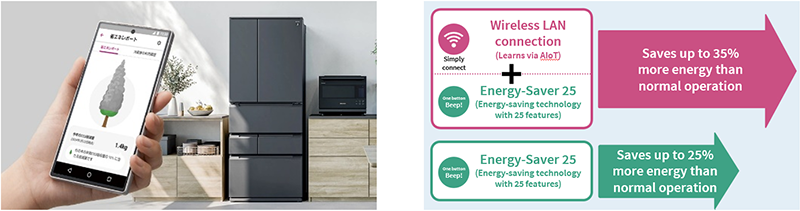 The refrigerator’s Connect to Save More cloud service function connects to a wireless LAN and enables AI on the cloud to learn about how the refrigerator is used and then to operate in an energy-saving manner according to the user’s lifestyle. By combining this with Energy-Saver 25, it is expected that energy savings of up to 35% can be achieved compared to normal operation.