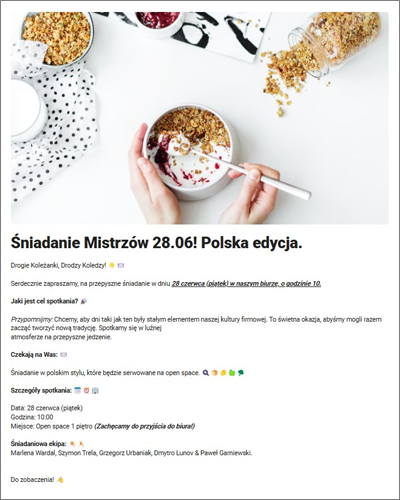 SCEP, Sharp’s production base in Poland, holds an in-house breakfast meeting once a month. This initiative is not just about enjoying a meal together but also to promote intra-organizational communication. At these meetings, employees share important information, such as the company’s KPIs, activities, and projects, thus helping ensure everyone is aware of work progress, goals, and future challenges.