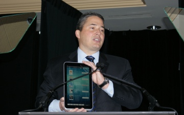 Bob Scaglione, CMO of SEC, later introduced the e-book reader/tablet terminal, GALAPAGOS. Stated was Sharp's intention to bring the service to the US sometime this year.
