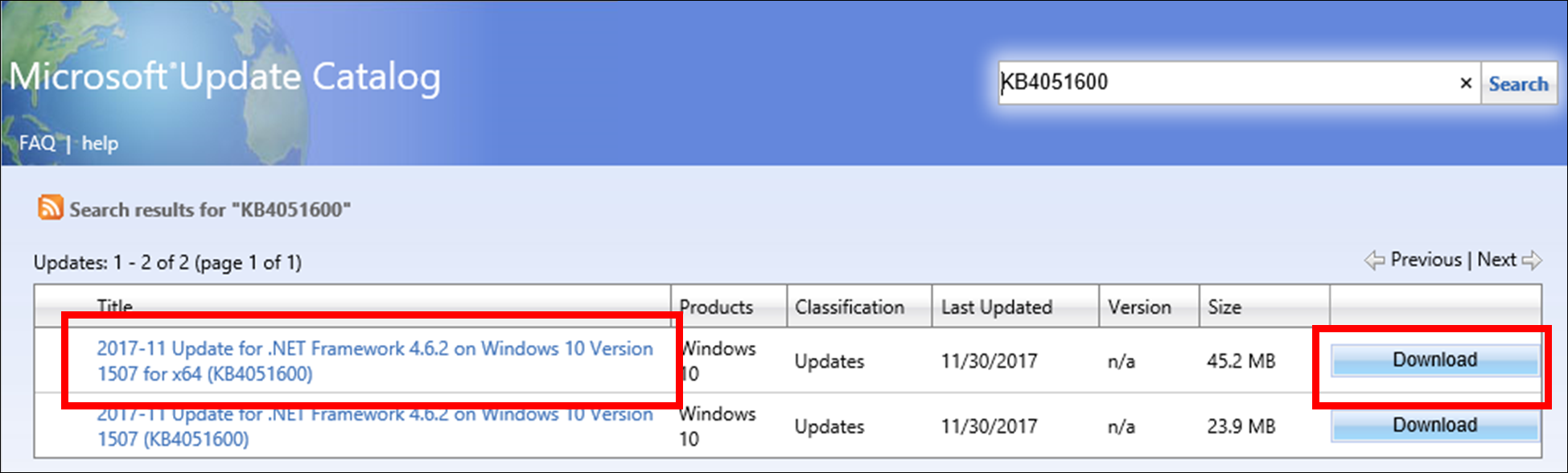 - If several updates are shown on Microsoft Update Catalog, download the update with the description of "for x64-based Systems" or "for x64." (NOTE: The following picture is example of selection of “ for x64-based Systems” or “for x64”)