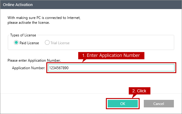 3. [Online Activation] Screen will appear. Enter your product key application number into the entry field then click [OK].