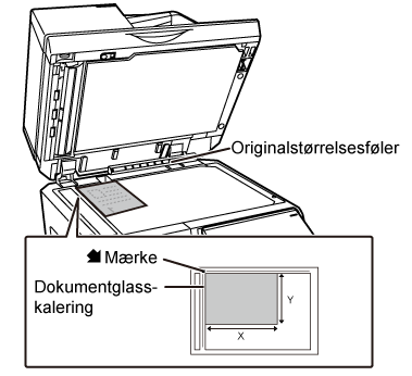 Læg originalen med forsiden nedad, og få originalens øverste venstre hjørne til at flugte med glaspladens bageste venstre hjørne (ved spidsen af mærket