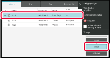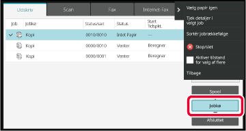 Tryk på det job, du vil stoppe eller slette, og tryk derefter på tasten [Stop/slet] på handlingspanelet.